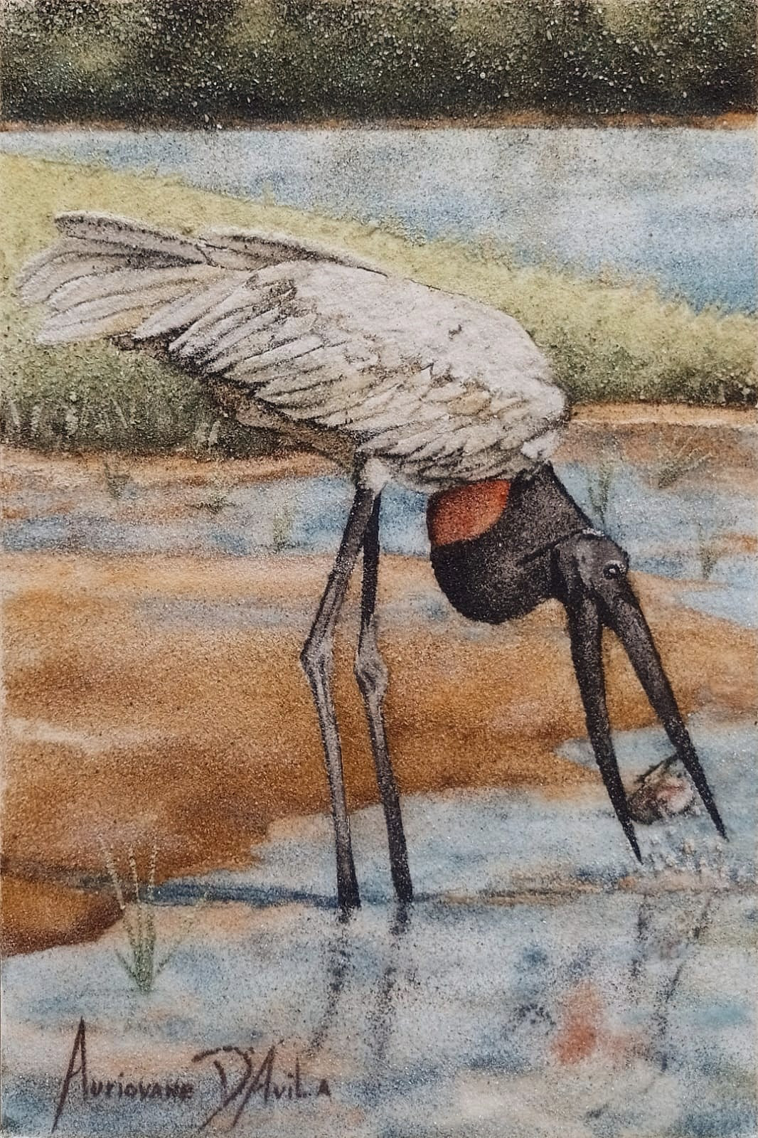 A imponência do Tuiuiú em seu momento de alimentação nas águas pantaneiras.