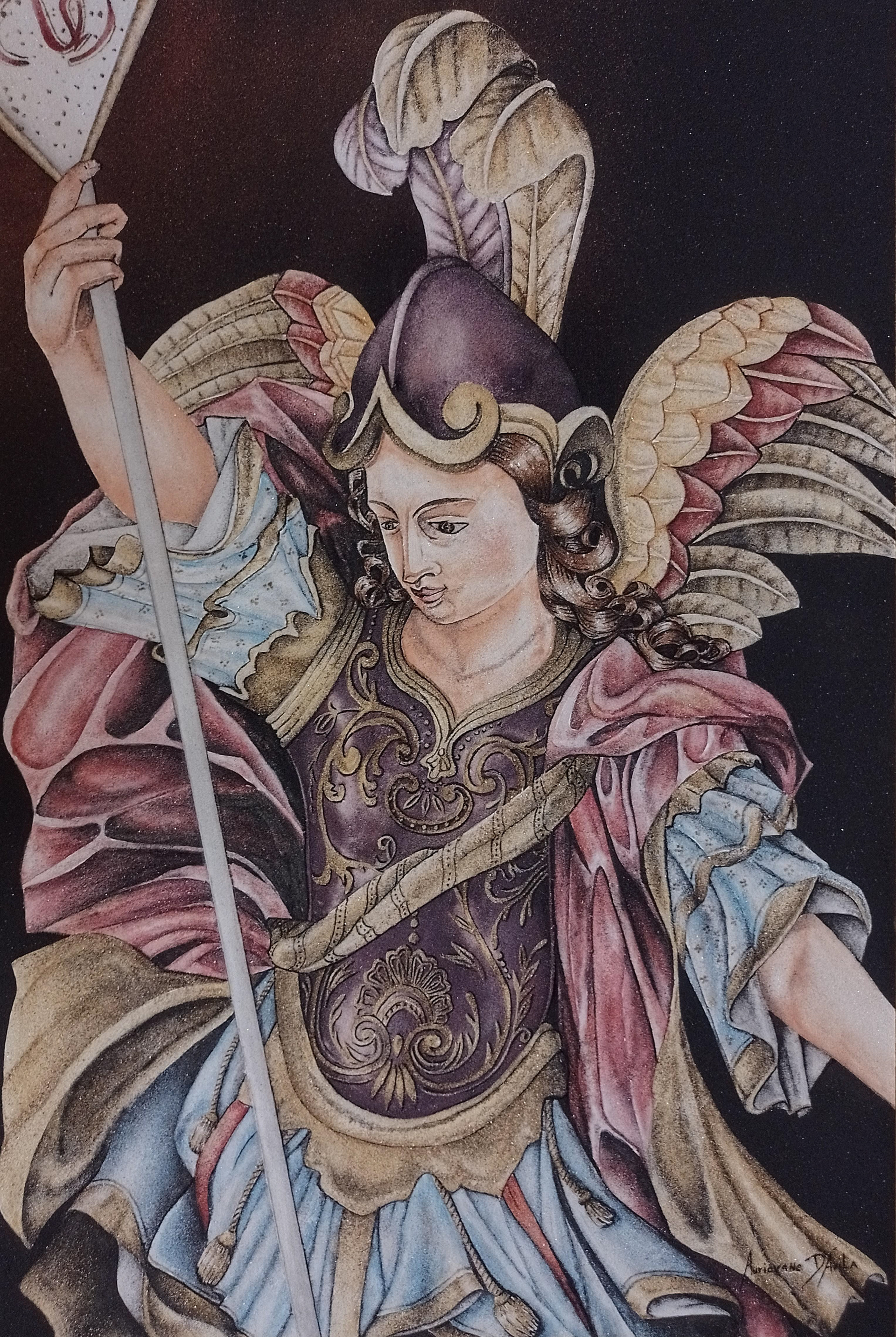 A força divina e a determinação do arcanjo na batalha contra o mal. A lança e o olhar firme simbolizam a proteção e o triunfo da luz