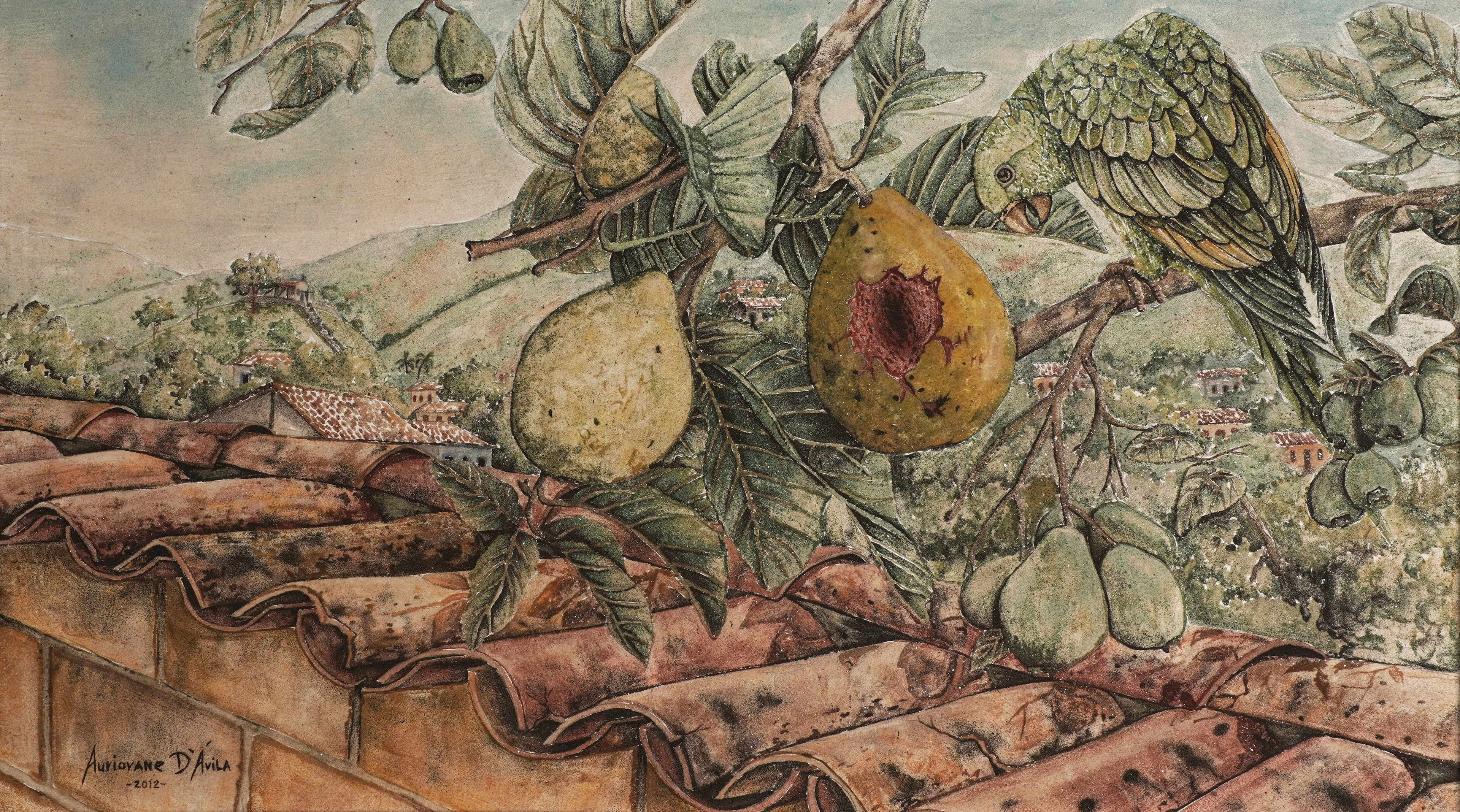 Savoring a guava, a scene rich with daily life and the simple joys of the land. Through natural sands, the piece explores the textures of roof tiles and lush foliage, creating a dialogue between the built environment and the wild. It celebrates the spontaneous beauty found in forgotten corners, a testament to nature's resilience and its symbiotic relationship with our homes.