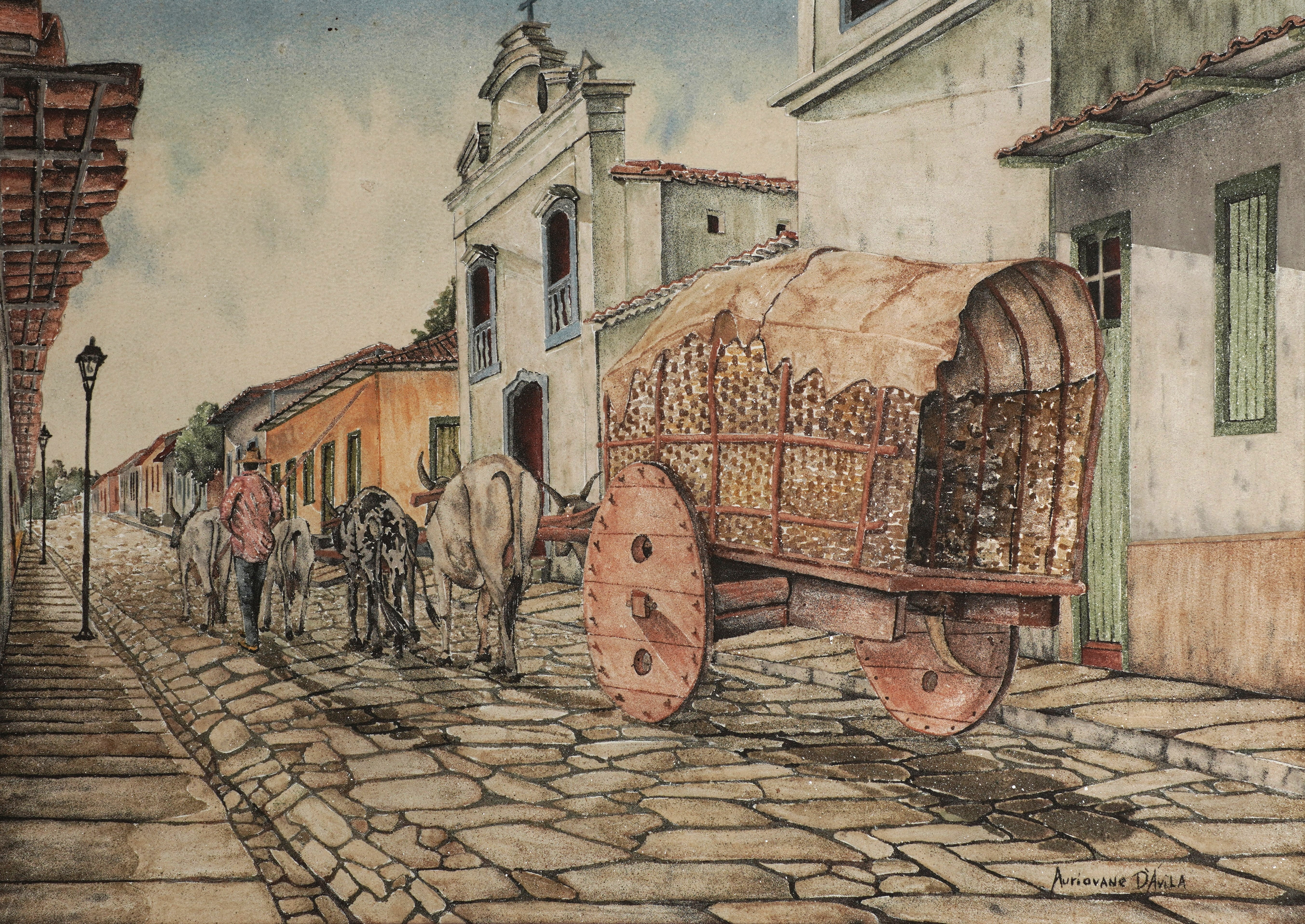 The ox cart is a symbol of Goiás’ rural heritage, carrying stories of work, journeys, and community. In this piece, layers of natural sand evoke the rhythm of wooden wheels on the cobblestone streets of Vila Boa, suggesting movement through time and territory. The textured surface preserves memory, while also honoring the historic city of Goiás — recognized as a UNESCO World Heritage Site — where tradition and history remain deeply alive.