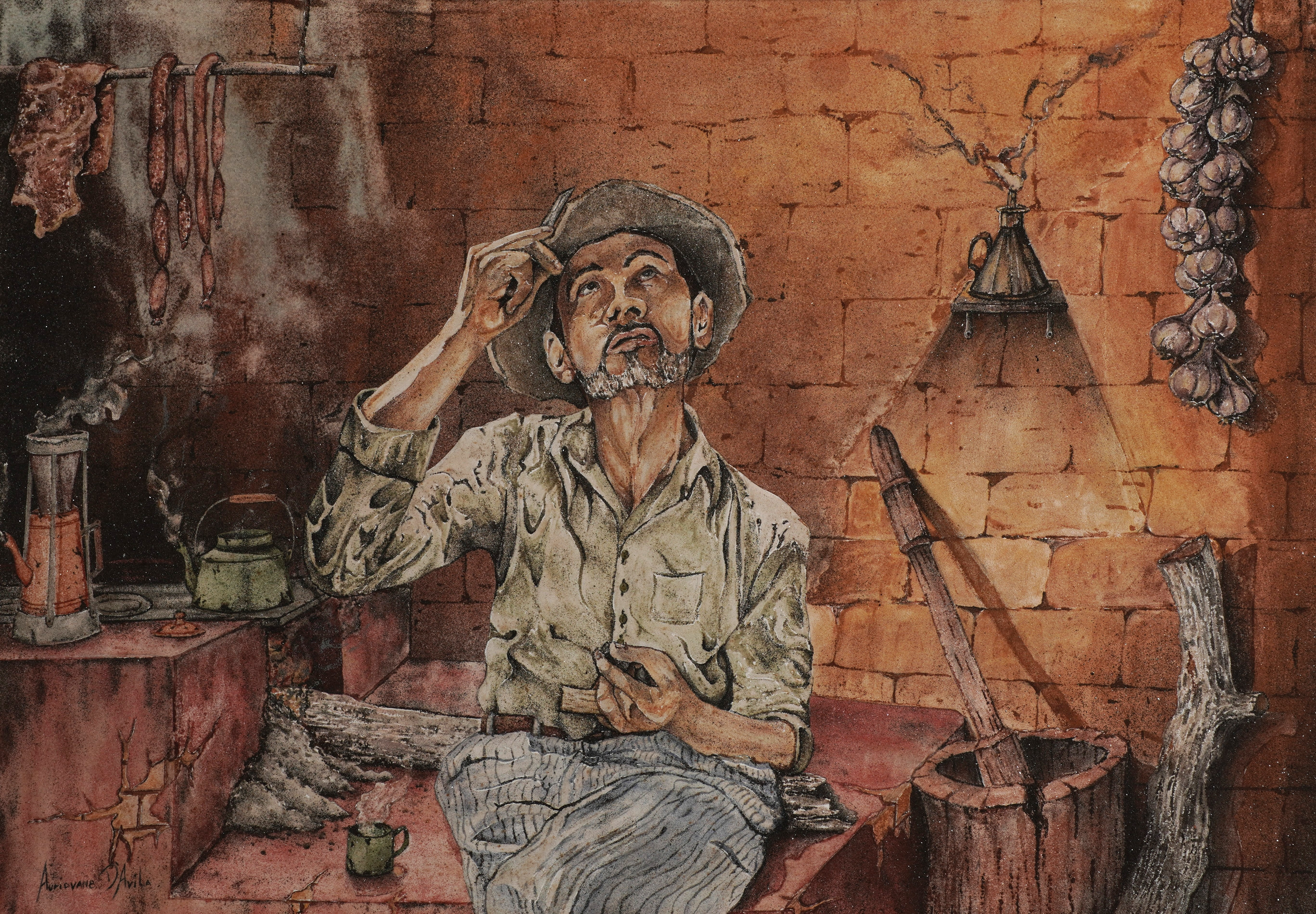 In this work, time seems suspended. Geraldinho, a figure both simple and enigmatic, inhabits a space of raw bricks where every object holds a memory: garlic hanging, meat curing, coffee boiling, a lantern casting its soft light. Seated on the stove, he gazes upward as if seeking an invisible answer, a lost thought, an intimate revelation. His gesture—between lighting a cigarette and a meditative pause—captures the banality of routine and the profound depth of existence. Geraldinho becomes more than an ordinary man: he is rural solitude, silent wisdom, and the poetry hidden in the simplest of gestures. A mystery made of silence, smoke, and sand.