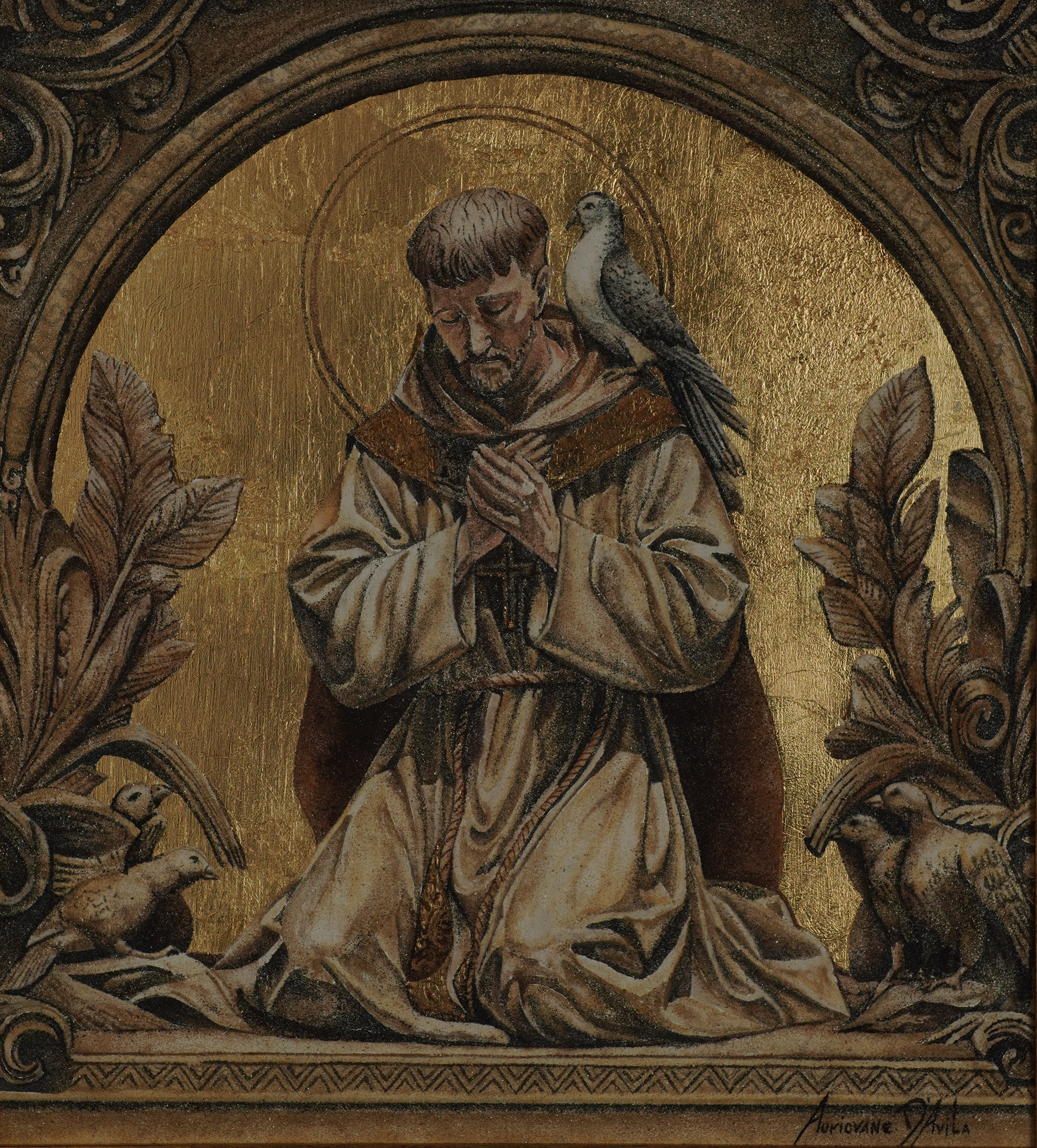 Through natural sand on a gold-leaf background, the work captures the serenity of Saint Francis. The material’s granular texture lends a unique depth, while the bird on his shoulder celebrates the saint’s faith, humility, and deep connection with nature and the sacred.